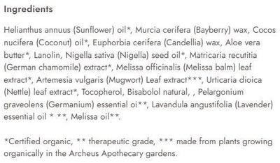 Helianthus annuus (Sunflower) oil*, Myrica cerifera (Bayberry) wax, Cocos nucifera (Coconut) oil*, Euphorbia cerifera (Candellia) wax, Aloe vera butter*, Lanolin, Nigella sativa (Nigella) seed oil*, Matricaria recutitia (German chamomile) extract*, Melissa officinalis (Melissa balm) leaf extract*, Artemesia vulgaris (Mugwort) Leaf extract***, Urticaria dioica (Nettle) leaf extract*, Tocopherol, Bisabolol natural, , Pelargonium graveolens (Germanium) essential oi**, Lavandula angustifolia (Lavender) essential oil **, Melissa officinalis (Melissa) oil**.