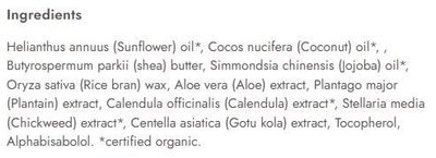 Helianthus annuus (Sunflower) oil*, Cocos nucifera (Coconut) oil*, , Butyrospermum parkii (shea) butter, Simmondsia chinensis (Jojoba) oil*, Oryza sativa (Rice bran) wax, Aloe vera (Aloe) extract, Plantago major (Plantain) extract, Calendula officinalis (Calendula) extract*, Stellaria media (Chickweed) extract*, Centella asiatica (Gotu kola) extract, Tocopherol, Alphabisabolol.