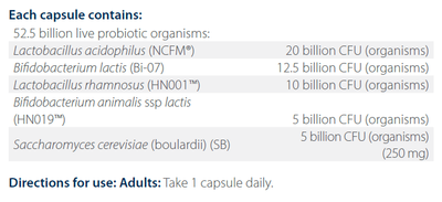 Contains 52.5 billion live organisms from five probiotics at researched strengths.